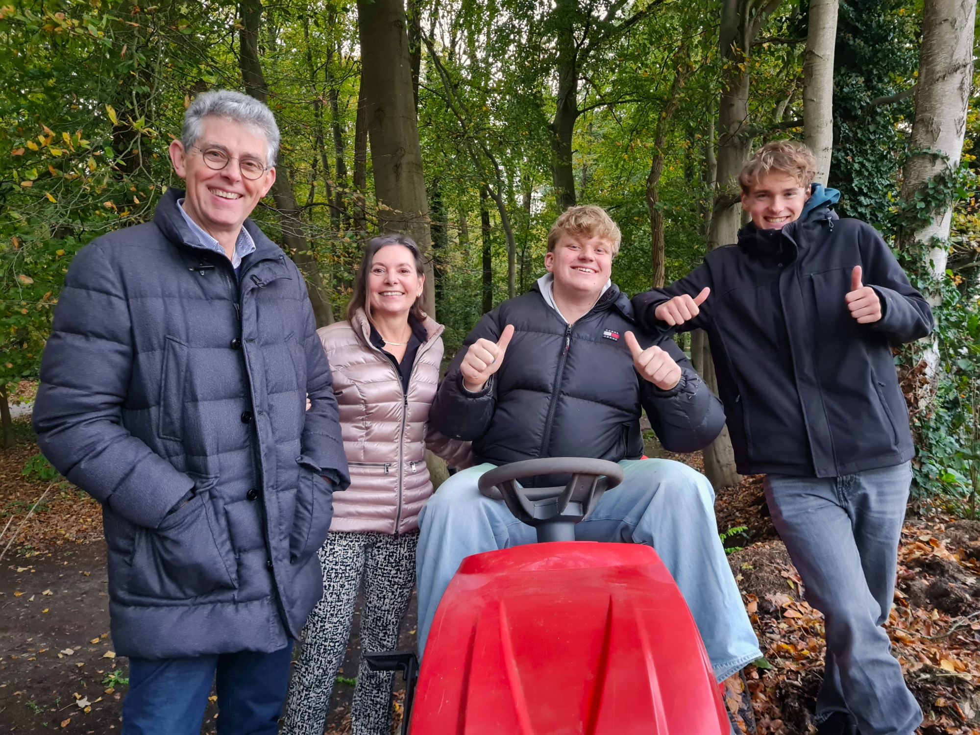Zo vertelt Chris -bij wie Lukas de tuin doet- dat hij stoeide met uitwaaierende grashopen na het maaien. Lukas reed gewoon met maaier en al de grashoop op om ‘de hoogte in te werken’. Chris vindt het prachtig om te zien hoe zelfstandig Lukas werkt.