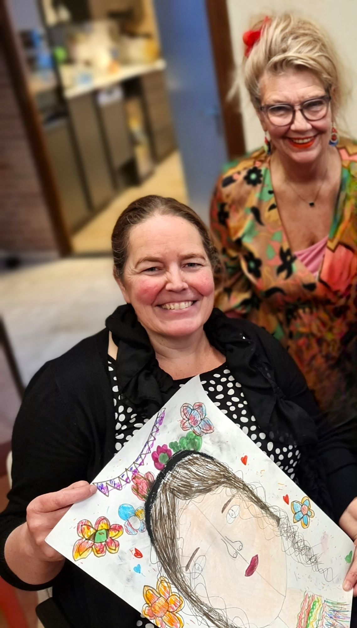 Het zelfportret van Riet (86 jaar) ziet er positief uit. ‘Dat ben ik ook,’ zegt Riet. Ze kreeg veel op haar bordje in ’t leven, maar in beweging blijven helpt haar. Ze is vrijwilliger bij ‘Maakplaats BIC’ en vandaag zelf enthousiast deelnemer aan deze kunstmiddag.