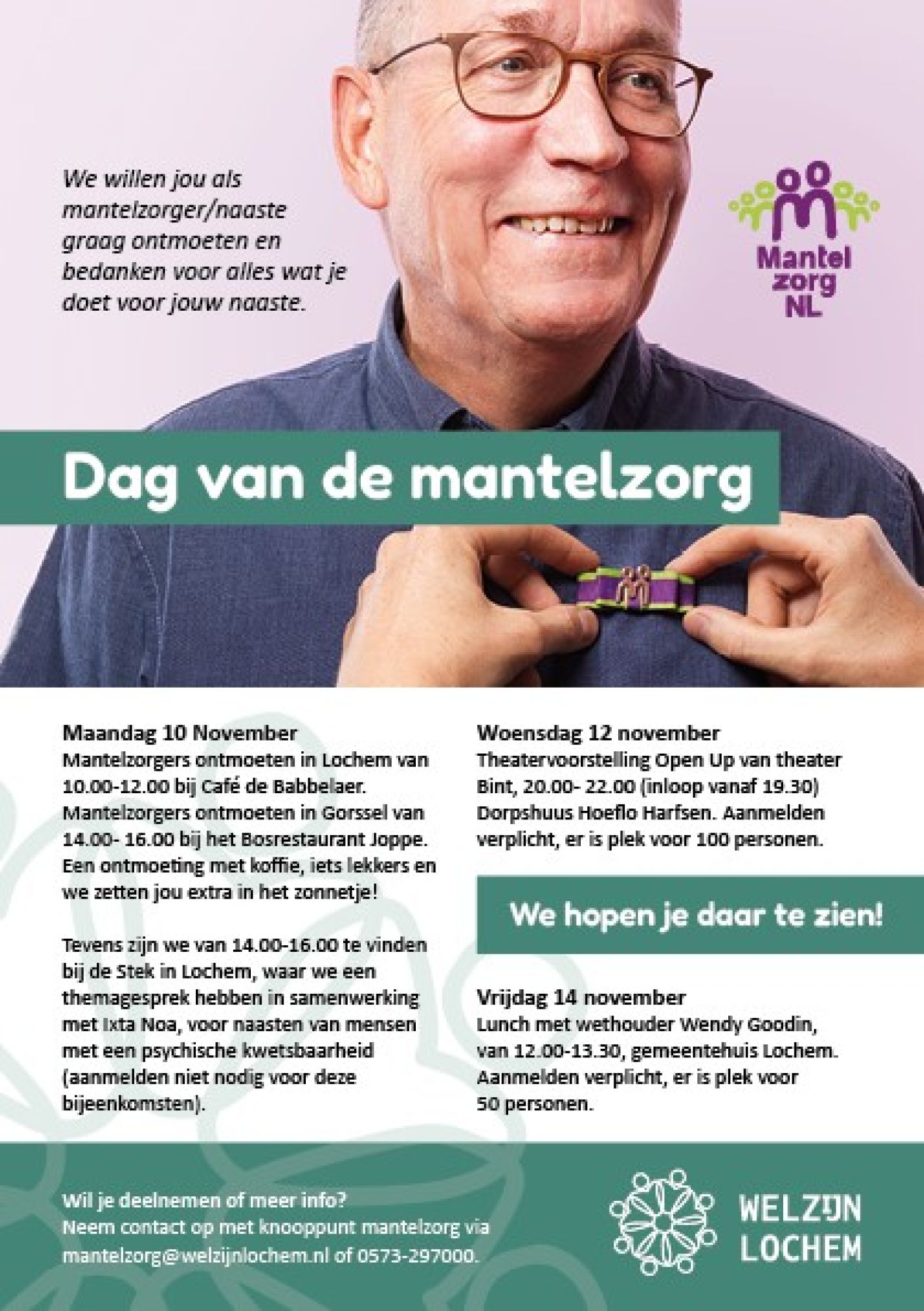 Rond de Landelijke Dag van de Mantelzorg op maandag 10 november zet Welzijn Lochem alle mantelzorgers in het zonnetje. De hele week zijn er ontmoetingen en activiteiten speciaal voor mantelzorgers uit de gemeente Lochem. Om dankjewel te zeggen voor alles wat jullie doen.Maandag 10 november